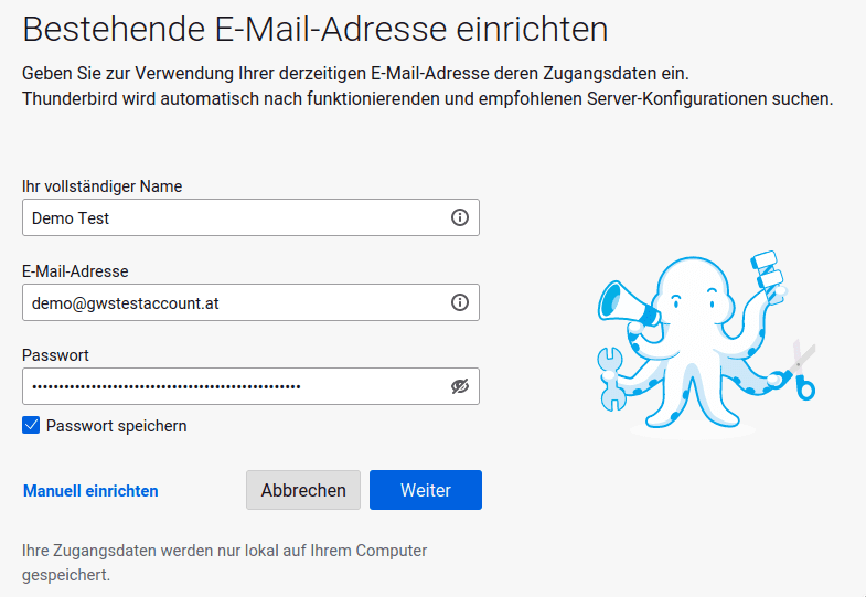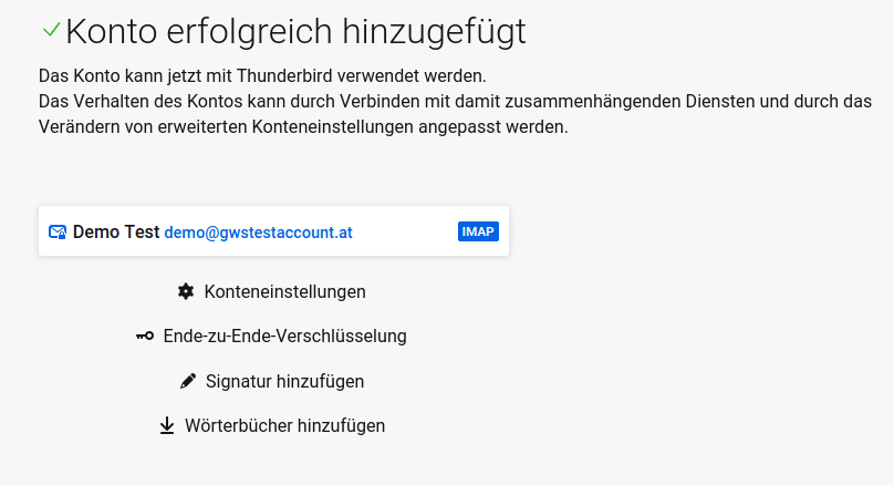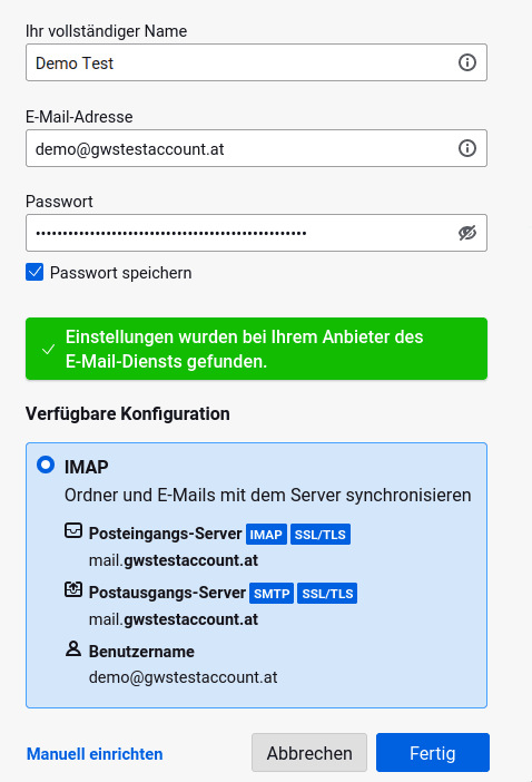 Nun werden dir die Einstellungen gezeigt, die Thunderbird erkannt hat. Posteingangs- und Postausgangs-Server sollten mail.deinedomain.net sein, in unserem Beispiel ist das „mail.gwstestaccount.at“. Als Kontotyp empfehlen wir in den meisten Fällen IMAP.