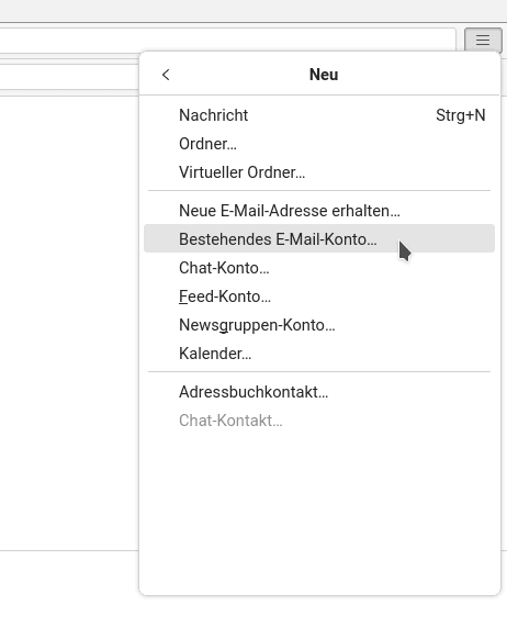 Andernfalls klicke rechts oben auf das Burgermenü, auf den obersten Eintrag „Neu“ und weiter auf „Bestehendes E-Mail-Konto“.