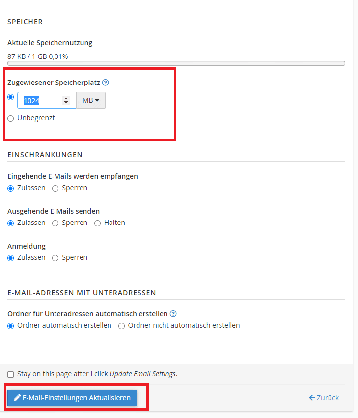 Auf der Seite „E-Mail -Konto Verwalten“ gehe zu SPEICHER -> Zugewiesener Speicherplatz und gibst du den Wert die du benötigst.