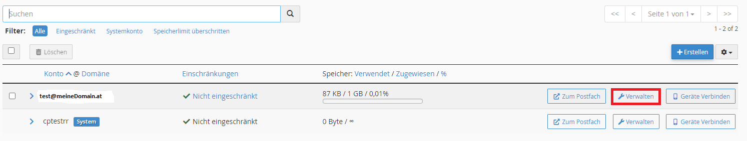 Wenn das nicht ausreicht, kannst du dem Account in der Verwaltungsoberfläche cPanel unter E-Mail > E-Mail-Konten mehr Platz zuweisen. Klicke neben dem betreffenden Account auf „Verwalten“. Falls du selbst keinen Zugang dazu hast, wende dich bitte an die Person, die dir den E-Mail-Account eingerichtet hat.