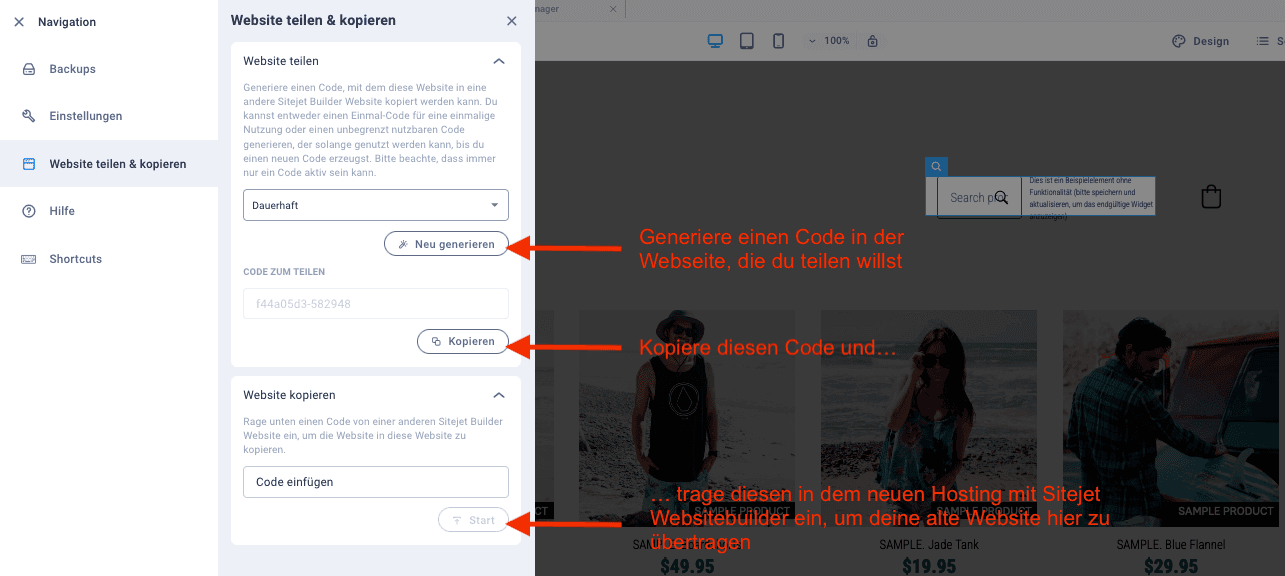 Dies ist hilfreich, wenn du zB eine mit Sitejet erstellte Website auf eine andere Domain übertragen möchtest, und dann nur Inhalt änderst. Oder wenn du in unserem Testaccount bereits etwas Tolles gestaltet hast, und dies in deiner Zahlvariante mit Sitejet weiterverwenden möchtest.