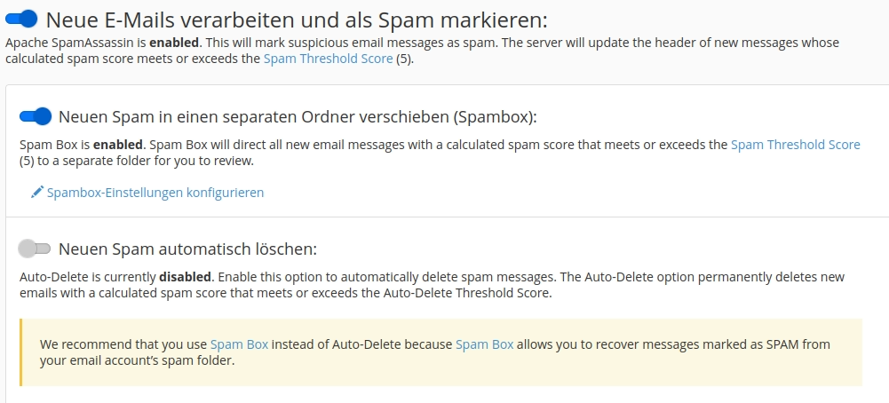 In cPanel kannst du im Bereich „E-Mail“ unter dem Punkt „Spamfilter“ deine Spam-Einstellungen überprüfen.