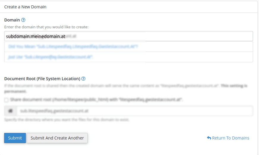 Wichtig: Entferne das Häkchen bei „Share document root (/home/…)“, damit ein eigener Ordner für die Subdomain erstellt wird.