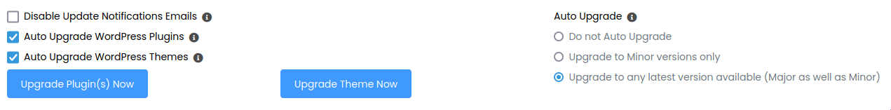 Mit den Optionen „Auto Upgrade WordPress Plugins“ und „Auto Upgrade WordPress Themes“ kannst du dafür sorgen, dass Plugins und Themes immer aktuell gehalten werden. Gerade bei Updates von Plugins kann es zu Problemen kommen. Wir empfehlen diese Optionen trotzdem für alle, die sich nicht ganz sicher sind, dass sie diese Elemente regelmäßig manuell aktualisieren werden, da das Sicherheitsrisiko veralteter Plugins beträchtlich ist.